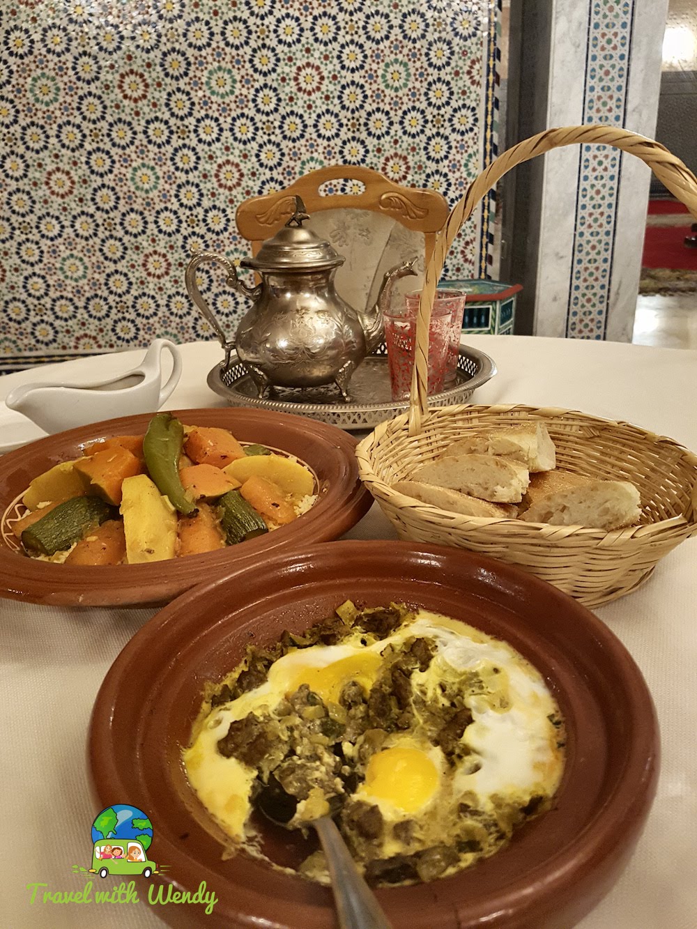 From the main lobby to our rooms all areas were decorated impeccably in the Moroccan style. We were excited to see they also offered a restaurant and it was so nice to schedule tomorrow’s breakfast right away! The menu that was offered (Amal prepared) consisted of several tagines (Carin was quite familiar with these dishes since she had visited Agadir this past December.)