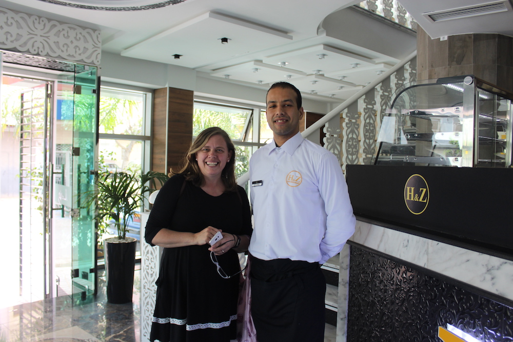 One of our favorite afternoon spots to “pop” into was at Café H&Z. This lovely little café in the heart of Nador offered an eclectic short menu of tacos, hamburgers, pizza, salads and fries. We made swift friends of Zouhir, who spoke perfect English. He was personable, fun and gave us “where to shop” tips. Winner, winner chicken dinner! Go upstairs if you prefer “non-smoking” and a beautiful view of a market square and mosque across the street. Oh, and from upstairs you can also see the beach!