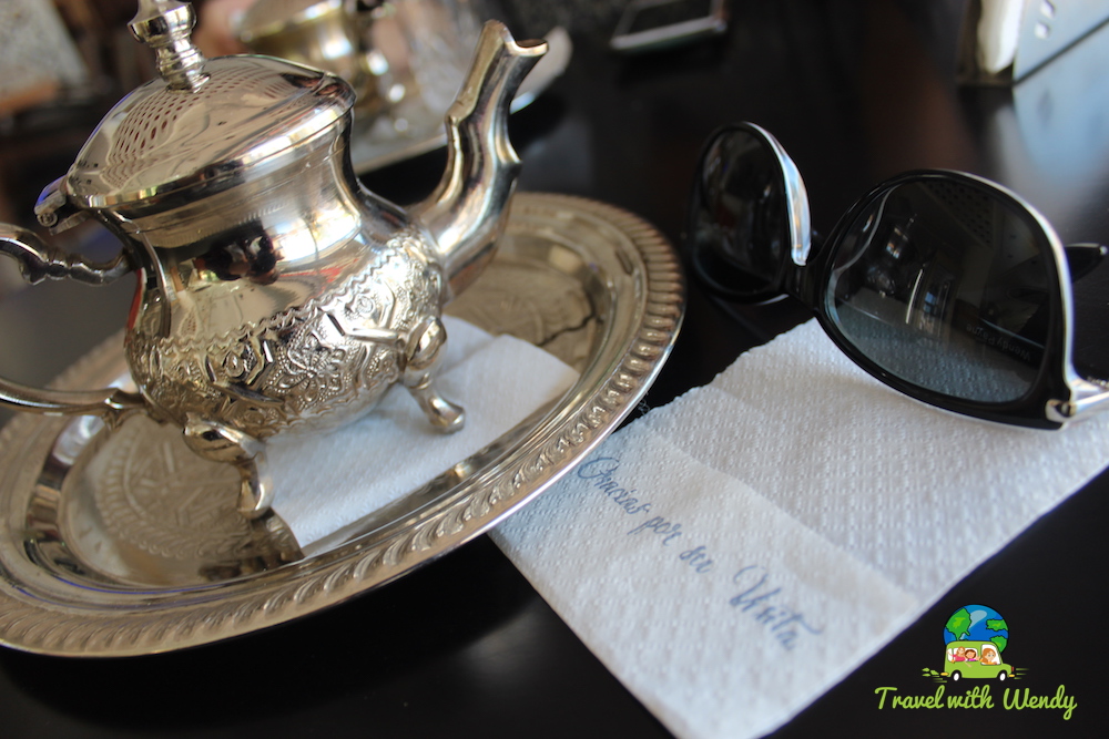 We visited a few times and my favorite was the cappuccino with a little chocolate syrup, I think it was Hershey’s! I had a little freak-out moment. Carin’s was the Moroccan tea….green tea with mint and a strong sugar punch!
